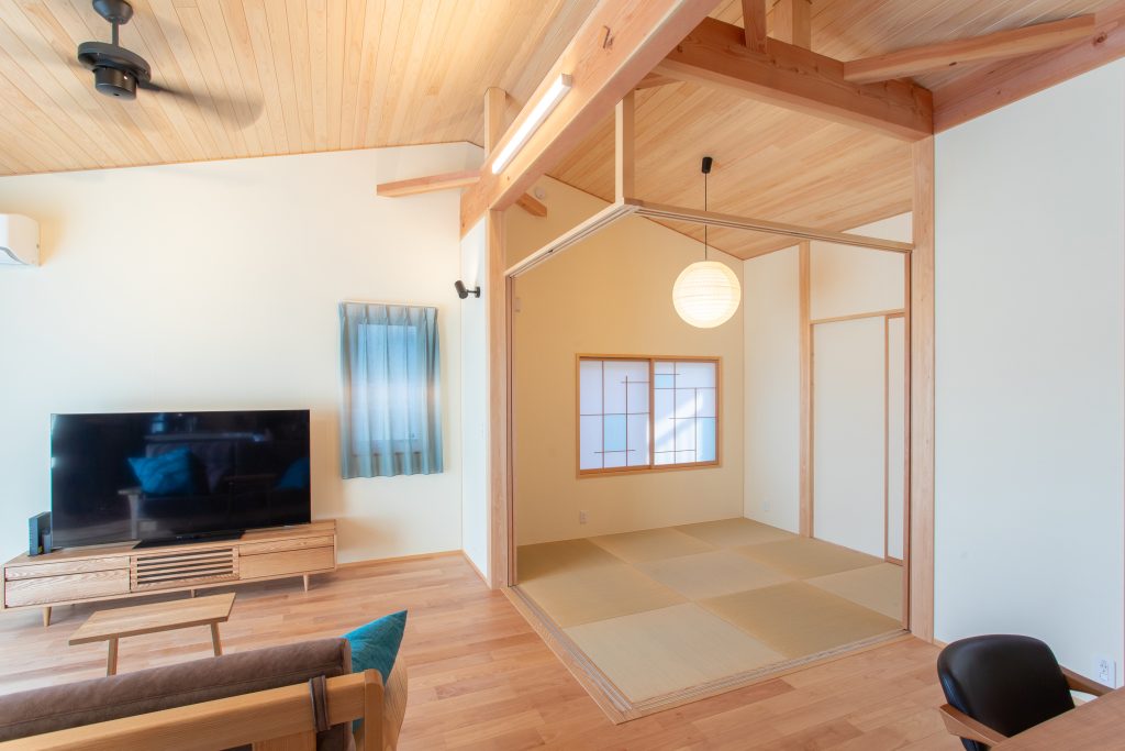 3部屋とっているため、LDKが小さくなっているが、介護想定の部屋は引き戸を開け放てばオープンになり、勾配天井とも相まって、開放的な空間が広がる。開け放てる造りは、介護者の気持ちを少しでも軽やかにする効果も。また、光と風が抜ける設計で、窓越しの景色も絵画のように心を癒してくれる。