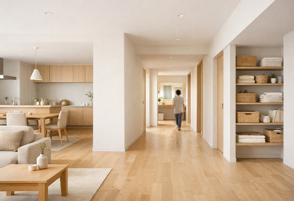 ワンフロアで完結するHiraの住まいは、毎日の移動を、自然で無駄のない流れに整えます。「移動する」ことが、少し楽になるだけで、暮らしは大きく変わります。