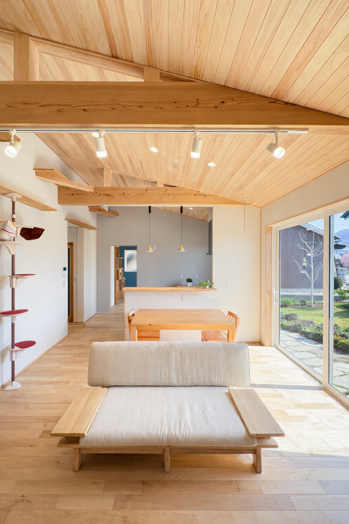 LDKの天井にはヒノキの羽目板。視線を上げると、木の温もりが広がります。